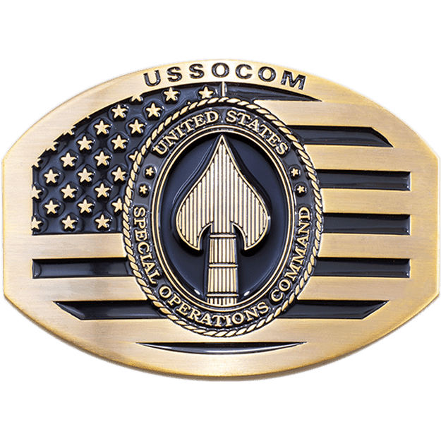 Custom box frame belt buckles are the most popular choice for soldiers because they’re required for military uniforms. No matter the branch of service, custom military belt buckles need to follow strict guidelines for size, shape and design. Box frame buckles attach to web belts using a hinge with teeth on one end that bite into the fabric of the belt. The belt itself slides into the box frame that’s secured to the back of the belt.