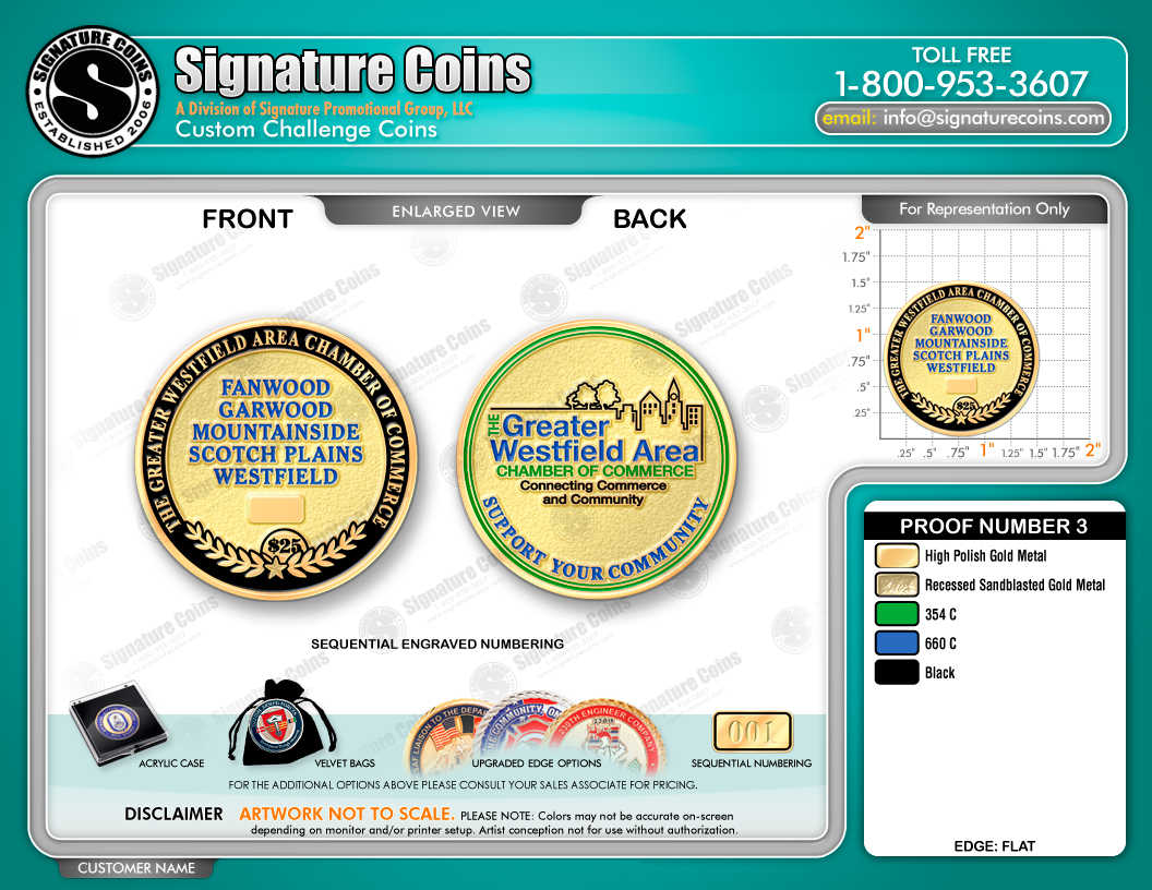 The Westfield Area Chamber of Commerce serves communities in New Jersey. The towns of Fanwood, Garwood, Mountainside, Scotch Plains and Westfield are all represented by the chamber; each is also represented on the front face of the current coins. It would have been easy enough to create a set of challenge coins that represented the different companies and members of the chamber. But the chamber had something a little more interesting in mind.