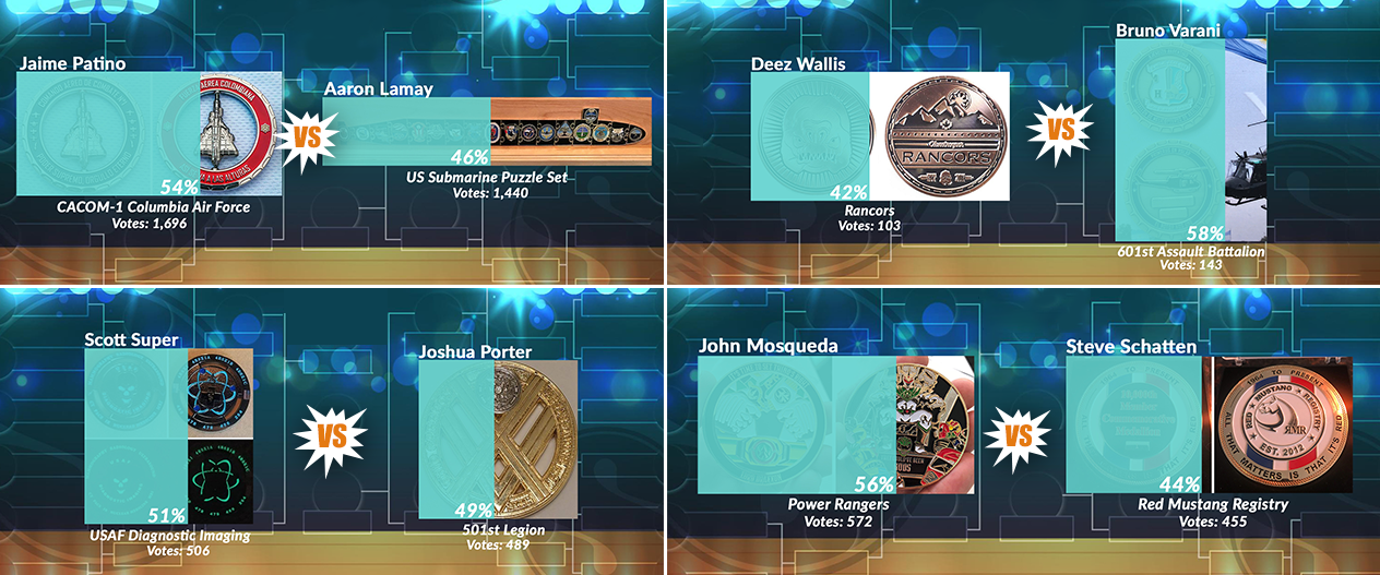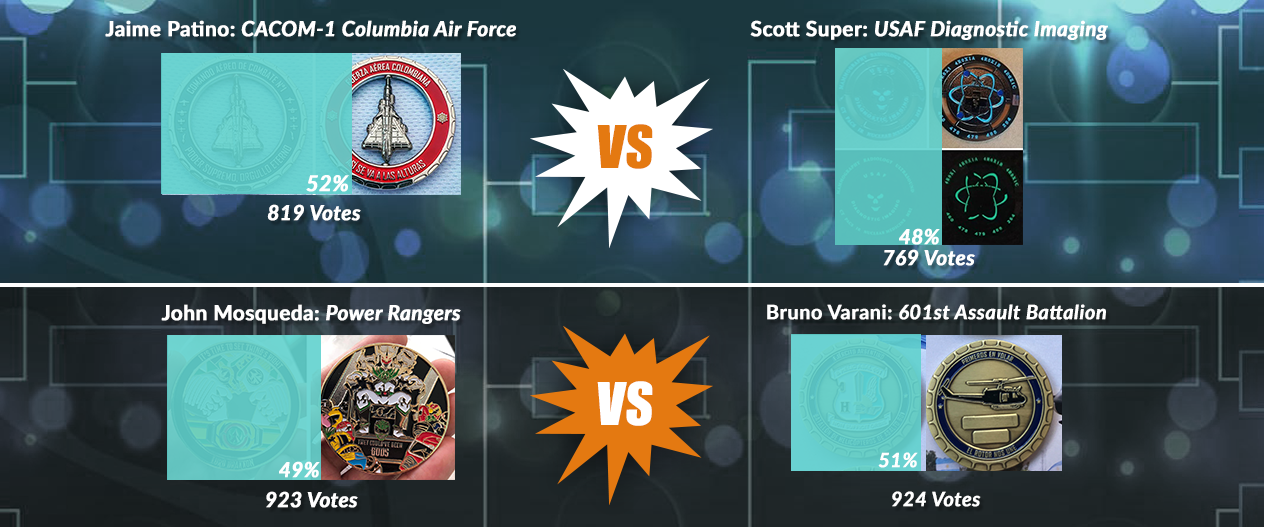 Jaime Patino’s Colombian Air Force coin usually plays to the competition, bringing in just enough votes to secure a victory. Bruno Varani may only have a third as many votes throughout the tournament, but his coin outscored Patino in the semifinals. Ultimately, the results of the final matchup in the NCCA Tournament are up to you. Keep an eye on our Facebook event page for updates and makes sure to keep voting. On Friday we will unveil the champion and recipient of 100 free challenge coins!
