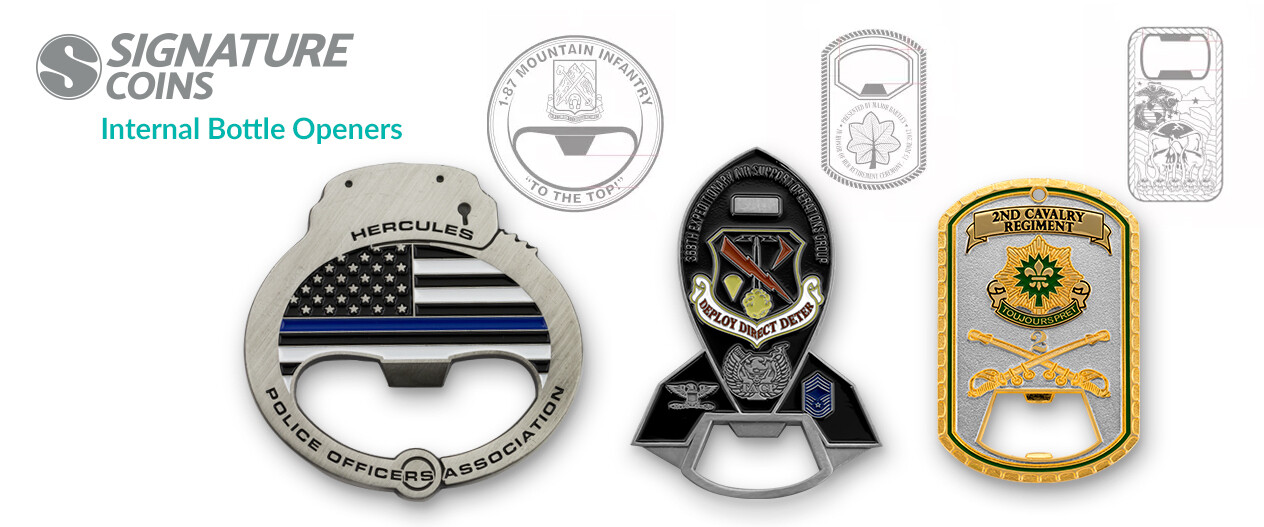 Create custom bottle opener challenge coins for Open That Bottle Night. Contact Signature Coins with your request for a free price quote today. We’ll send it and a digital file containing the custom artwork that our talented team of designers created for you.