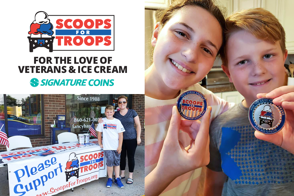 Over the years, we’ve been honored to help several organizations design special Veterans Day challenge coins that celebrate service and honor a soldier’s sacrifice, and this year, one specific organization caught our eye: Scoops for Troops.
