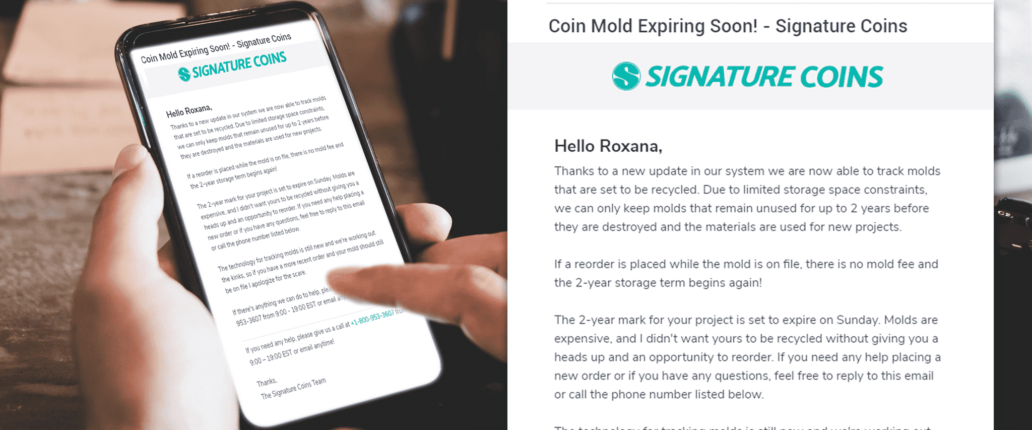 An email reminder will be sent to you before your mold expires. We keep all coin molds for two years after an order is placed, so check the date of your order. If a reorder is placed while the mold is on file, there is no mold fee and the 2-year storage term begins again!