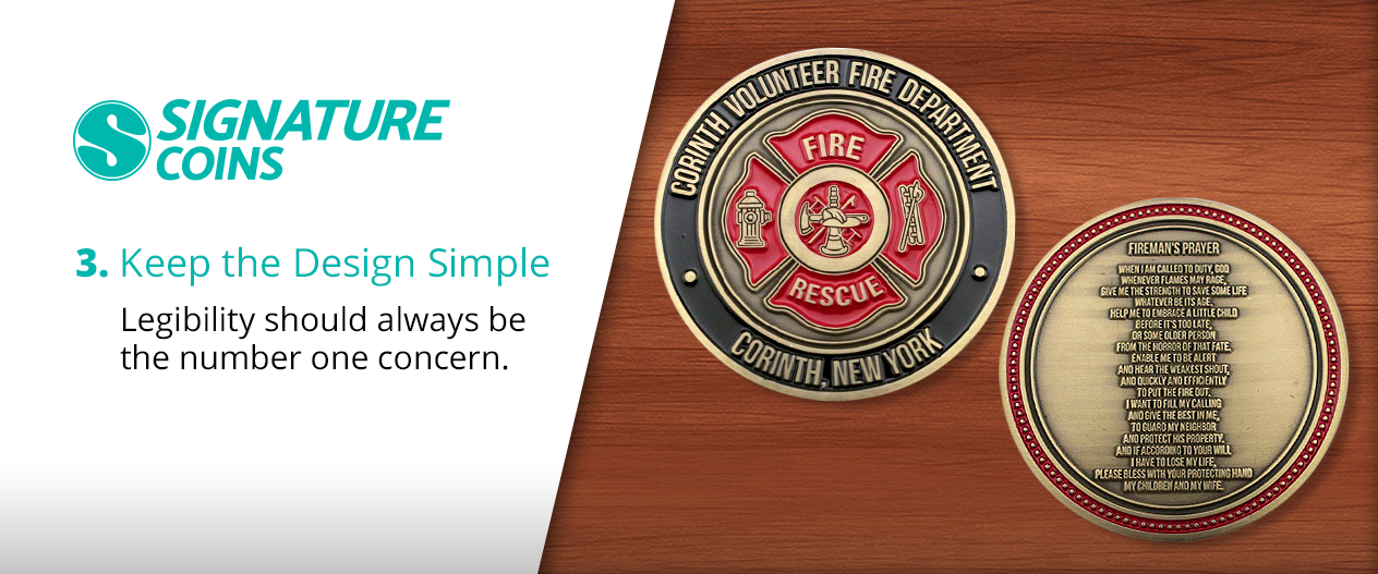Legibility should always be the number one concern when designing a text-heavy challenge coin. Having complex patterns or designs behind or around the message is going to be distracting for the reader. The best thing to do is to leave the area around the message clear like this Corinth Volunteer Fire Department coin.
