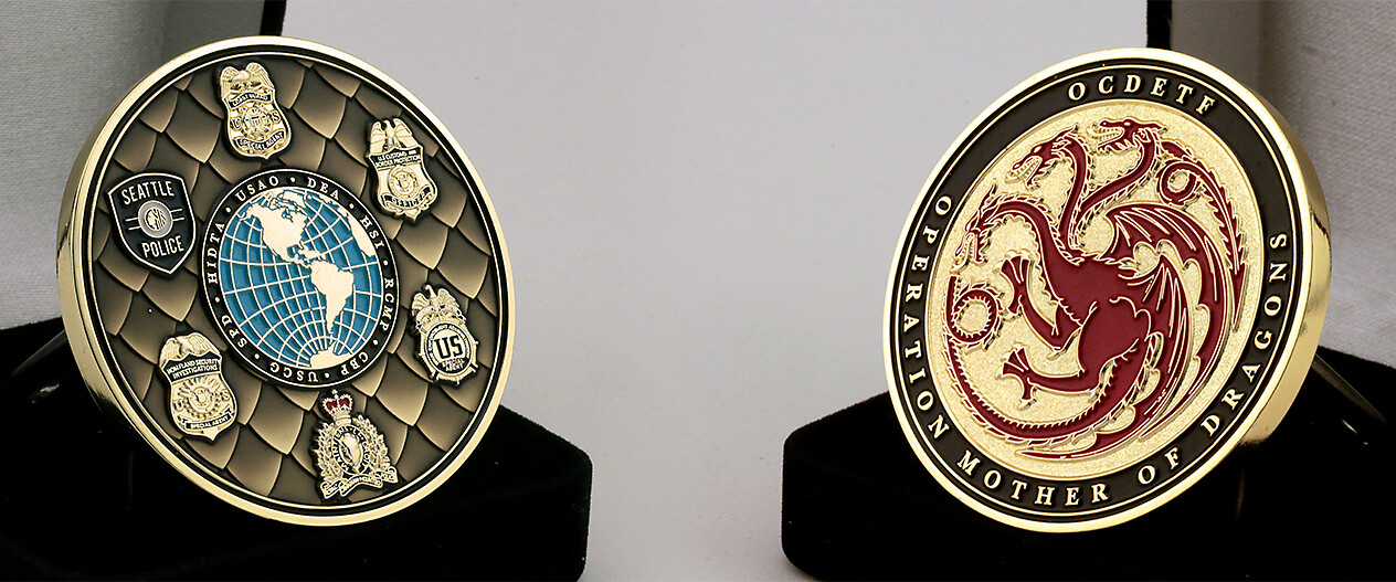 It’s always special when branches of government reach out to us to create a custom challenge coin. This DOJ coin for the Child Exploitation Criminal Division is one we’re particularly happy to have worked on. The fine detail of the binary just beneath the surface of the translucent blue paint and script design in the background of the coin are great examples of what our production team is capable of achieving.